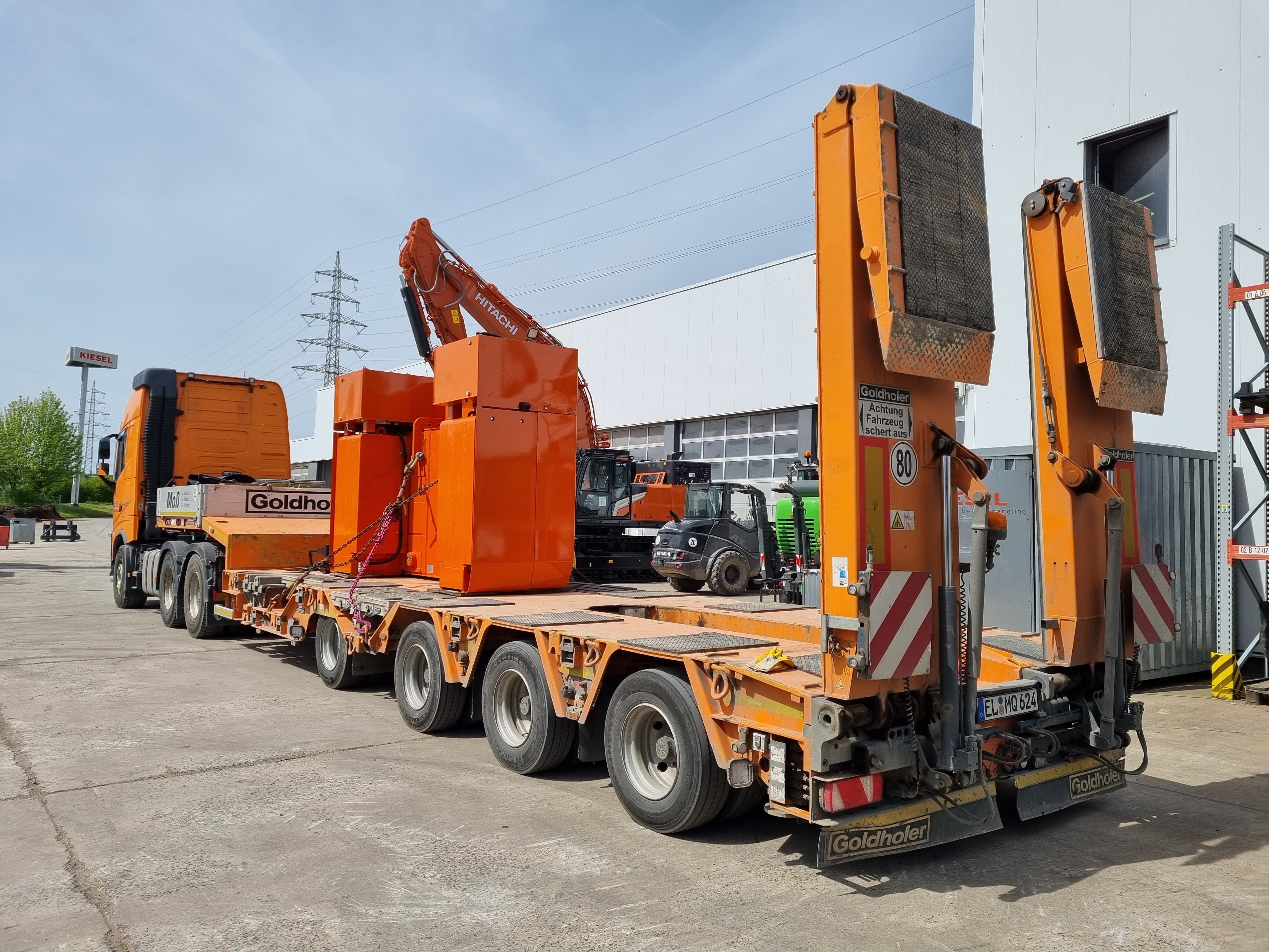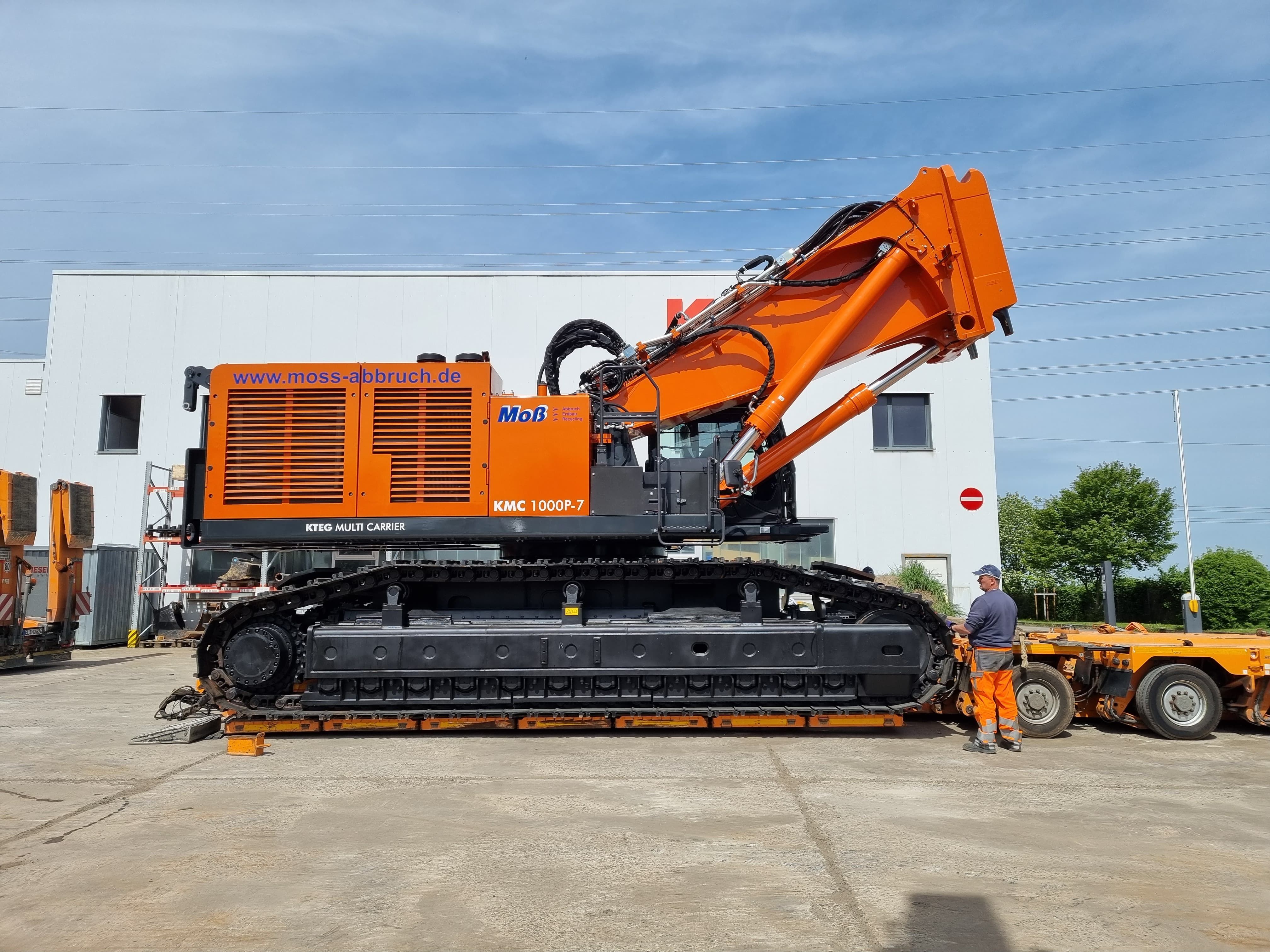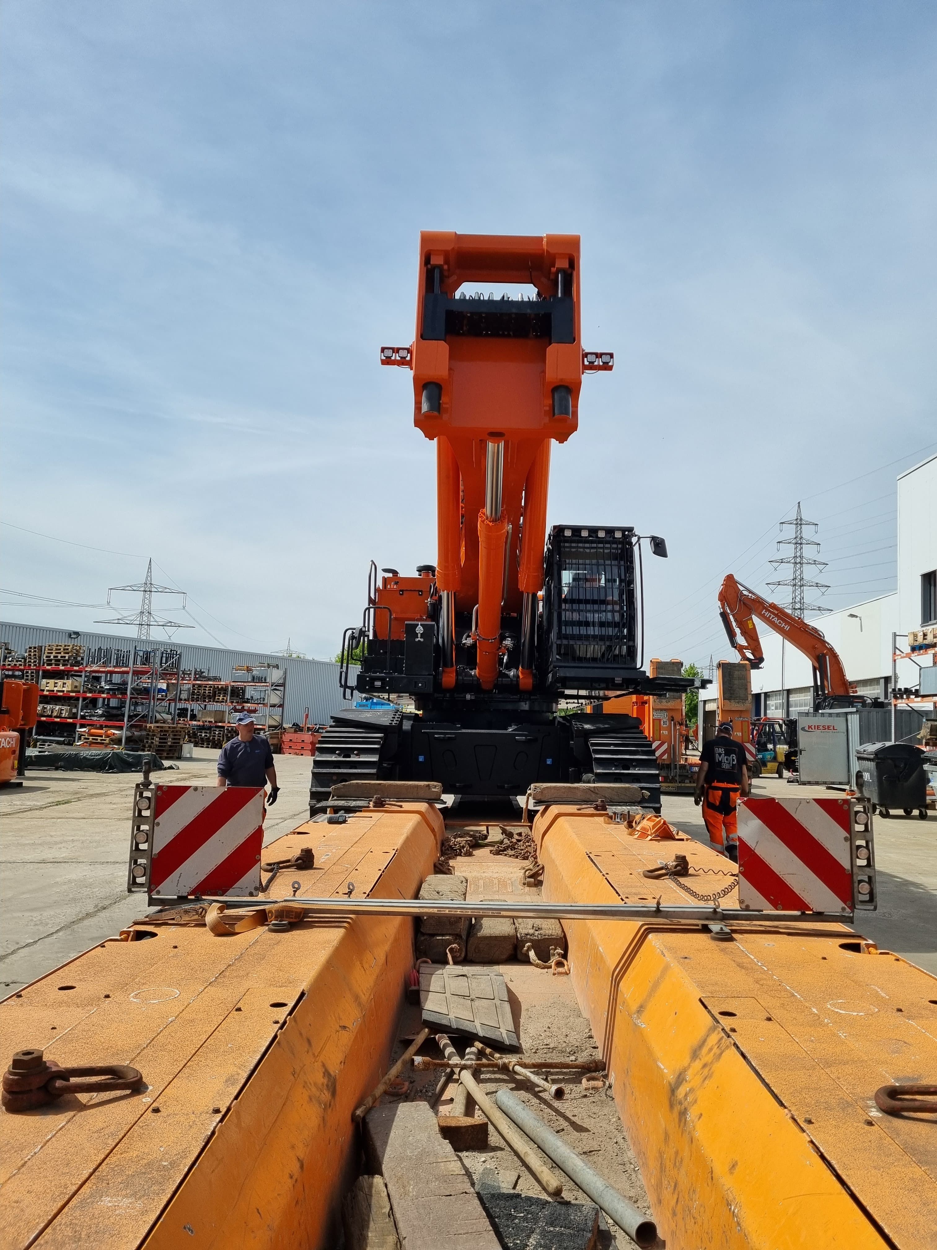 Nach der Abholung wurde der KMC1000P-7 zu unserer aktuellen Baustelle nach Düsseldorf gebracht. Dort hat er seinen ersten Einsatz. Mit einem Arbeitsgewicht von 150.000kg ist der Bagger ein echtes Koloss! Neben der verschiedenen Kabinenoptionen (Standardkabine, Kippkabine, hochfahrbare Kabine), damit man immer beste Sicht auf das Arbeitsfeld hat, glänzt der KMC1000P-7 vor allem durch das KTEG Boom Quick Connect System. Dieses System sorgt für einen Auslegerwechsel in weniger als 5 Minuten und damit ist es das einzige System dieser Art auf dem Markt, welches Maßstäbe in Sachen Arbeits-und Prozesssicherheit setzt.