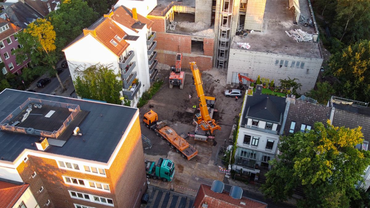 Als das alles geschafft war, haben wir unsere Bagger auf die Baustelle gebracht. So ein Schwertransport eines der größten Abbruchbagger Europas, der Hitachi ZX870, ist eine logistische Meisterleistung, wenn man bedenkt, dass die Baustelle mitten in der Bremer Innenstadt ist und die Zufahrtsstraße total eng ist. Hier den Tieflader mit einem Gesamtgewicht von 140 Tonnen und 30 Metern Länge rückwärts an die Baustelle zu fahren, das ist Königsklasse!